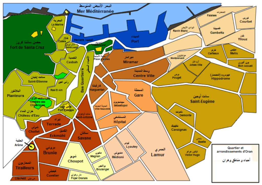 Oran, c’est aussi un centre ancien, situé en contre-bas du quartier français, accessible par des rues à forte pente. Là, on entre dans un autre univers : celui des bas quartiers, de l’ancienne Casbah, de l’ancienne ville ottomane, là où les Espagnols se sont établis, là aussi où les Français se sont installés en premier lieu après la « conquête ». Nous sommes dans la vallée, près du vieux port, dans le quartier Sidi El-Houari.